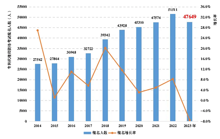 图4展示了2014-2023年专利代理师资格考试报名情况。2023年专利代理师资格考试报名人数为47649人。